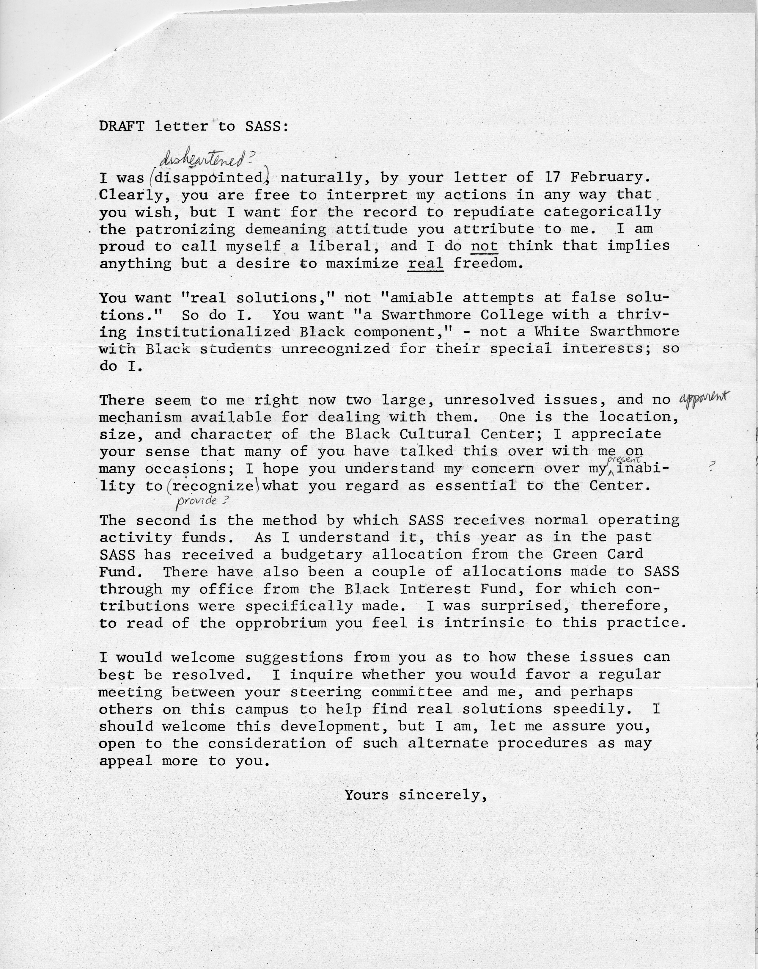 Robert Cross, “[Letter (draft, unsent) from Robert Cross to SASS 02/20/1970],” Black Liberation 1969 Archive, accessed December 7, 2025, https://blacklib1969.swarthmore.edu/items/show/468.