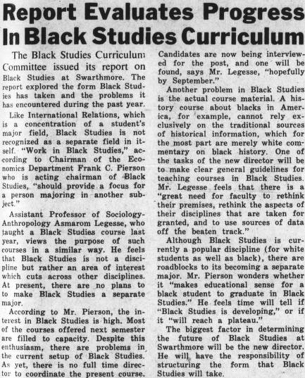 Phoenix, “Report Evaluates Progress In Black Studies Curriculum ,” Black Liberation 1969 Archive, accessed November 28, 2025, https://blacklib1969.swarthmore.edu/items/show/183.