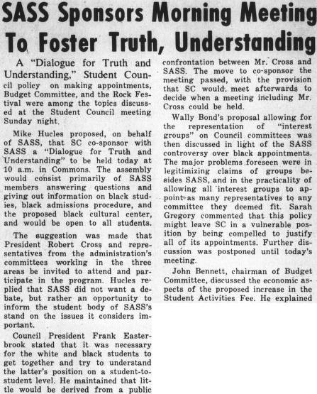 Phoenix, “SASS Sponsors Morning Meeting To Foster Truth, Understanding ,” Black Liberation 1969 Archive, accessed November 28, 2025, https://blacklib1969.swarthmore.edu/items/show/198.