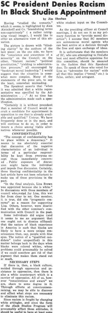 Phoenix and Jim Sheehan, “SC President Denies Racism In Black Studies Appointment ,” Black Liberation 1969 Archive, accessed November 27, 2025, https://blacklib1969.swarthmore.edu/items/show/203.