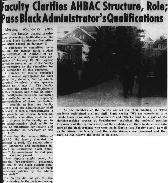 Phoenix, “Faculty Clarifies AHBAC Structure, Role; Pass Black Administrator's Qualifications ,” Black Liberation 1969 Archive, accessed November 28, 2025, https://blacklib1969.swarthmore.edu/items/show/254.