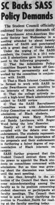Phoenix, “SC Backs SASS Policy Demands ,” Black Liberation 1969 Archive, accessed November 28, 2025, https://blacklib1969.swarthmore.edu/items/show/302.