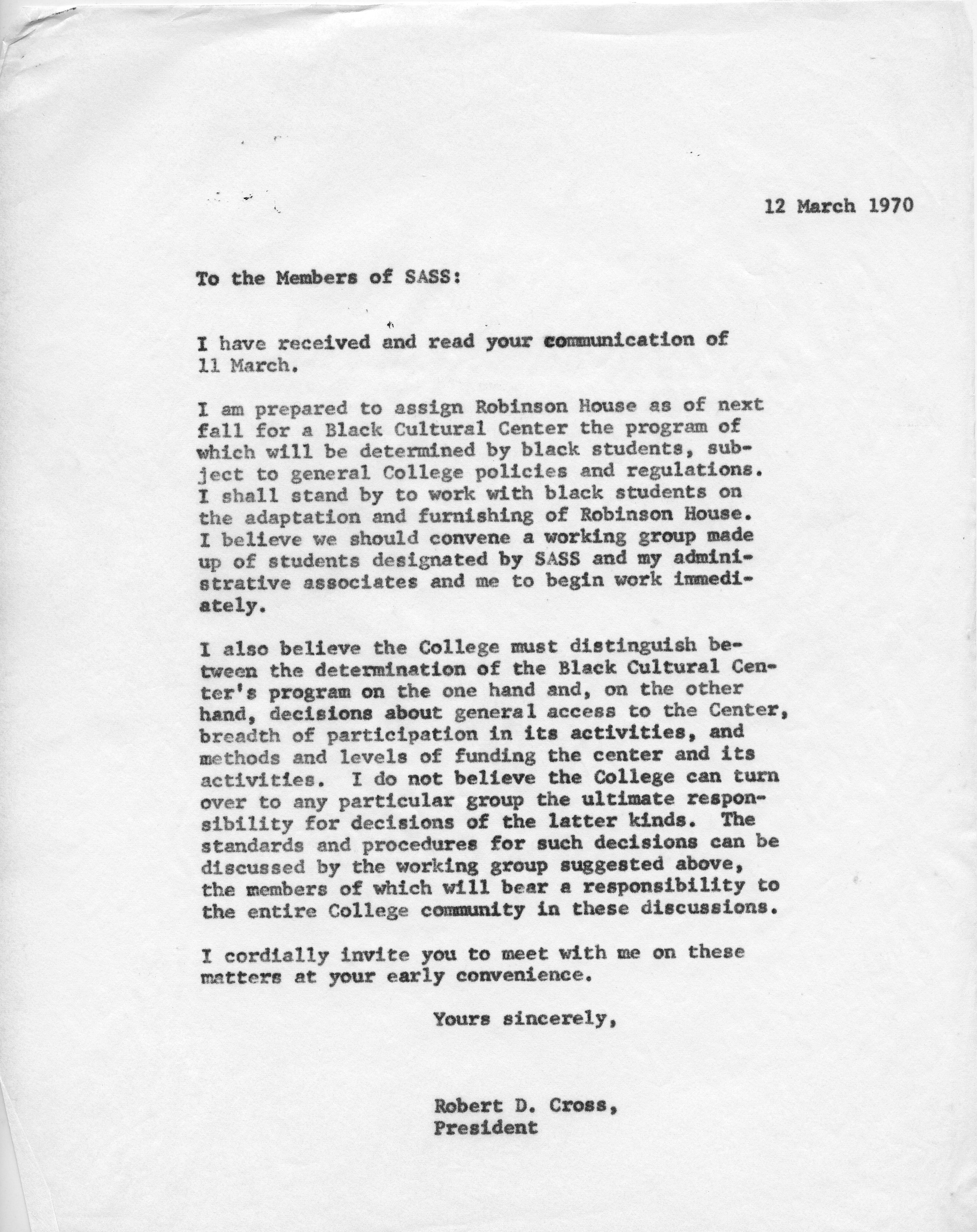 Robert Cross, “[Letter Robert Cross to SASS 03/12/1970],” Black Liberation 1969 Archive, accessed November 27, 2025, https://blacklib1969.swarthmore.edu/items/show/494.