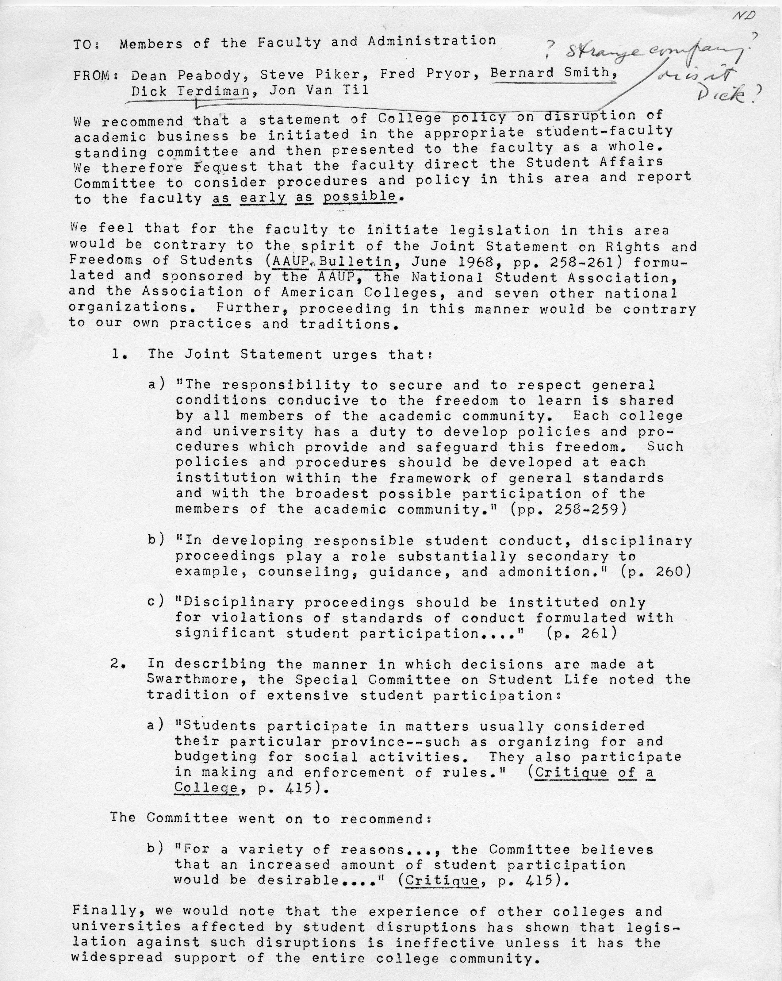 Dean Peabody et al, “[Letter to faculty and administration from 6 faculty members],” Black Liberation 1969 Archive, accessed November 25, 2025, https://blacklib1969.swarthmore.edu/items/show/544.