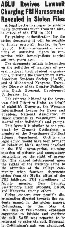 Phoenix, “ACLU Revives Lawsuit Charging FBI Harassment Revealed in Stolen Files ,” Black Liberation 1969 Archive, accessed December 3, 2025, https://blacklib1969.swarthmore.edu/items/show/64.