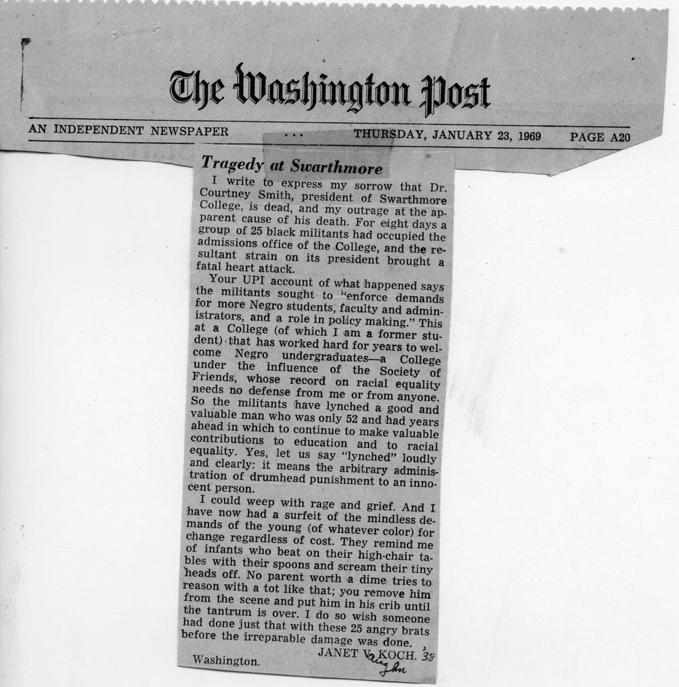 Janet Koch, “Tragedy at Swarthmore,” Black Liberation 1969 Archive, accessed November 27, 2025, https://blacklib1969.swarthmore.edu/items/show/733.