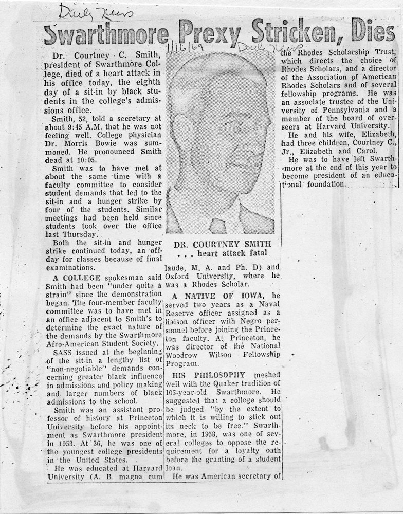 [none], “Swarthmore Prexy Stricken, Dies,” Black Liberation 1969 Archive, accessed November 27, 2025, https://blacklib1969.swarthmore.edu/items/show/772.