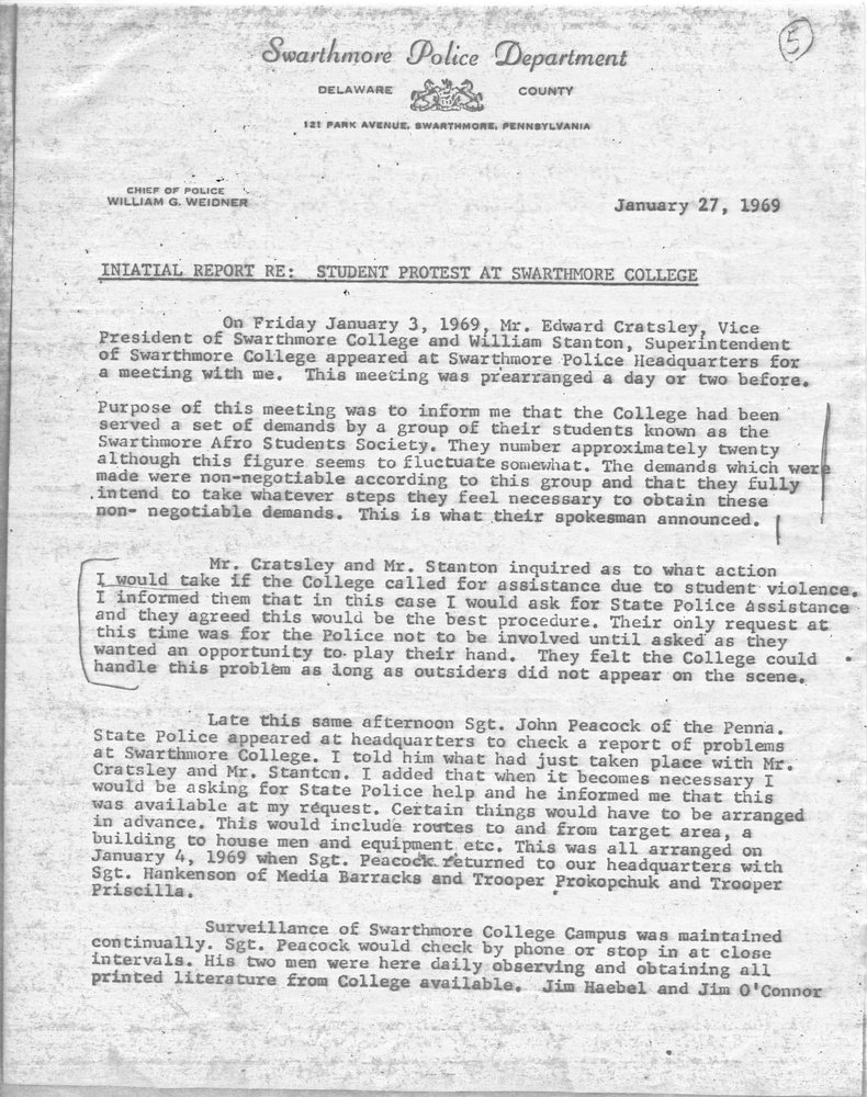 Swarthmore Police Department and William Weidner, “Initial Report Re: Student Protest at Swarthmore College,” Black Liberation 1969 Archive, accessed November 28, 2025, https://blacklib1969.swarthmore.edu/items/show/820.