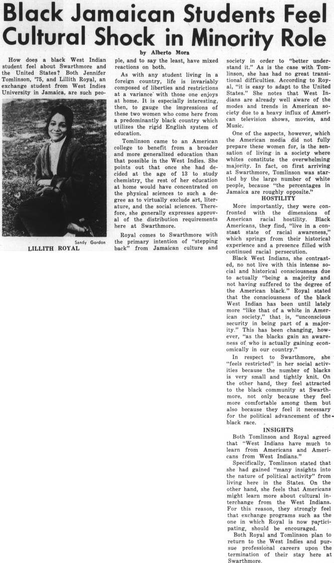 Phoenix and Alberto Mora, “Black Jamaican Students Feel Cultural Shock in Minority Role ,” Black Liberation 1969 Archive, accessed December 3, 2025, https://blacklib1969.swarthmore.edu/items/show/83.